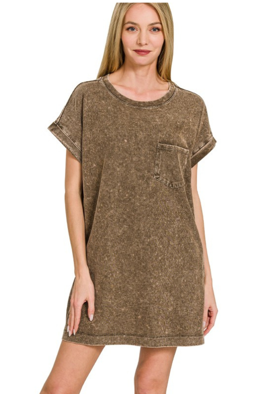 - Brown short sleeve mineral wash pocket t-shirt dress
