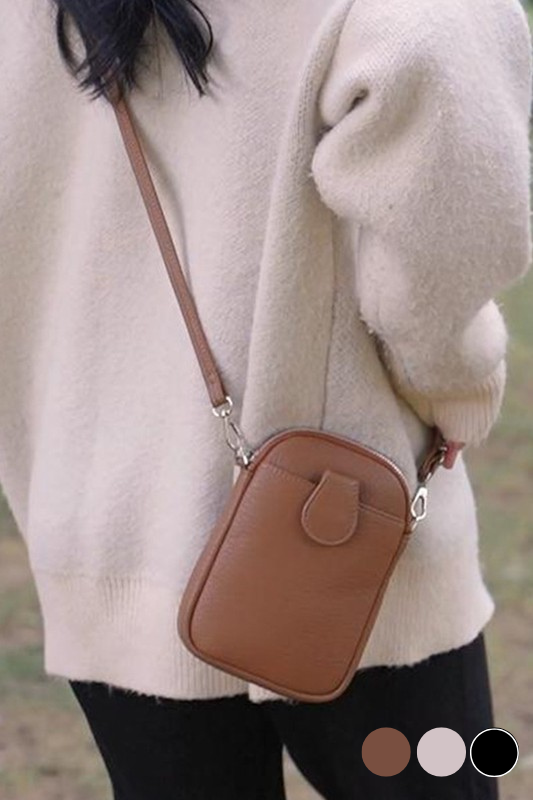 - Camel or cement vegan leather crossbody bag